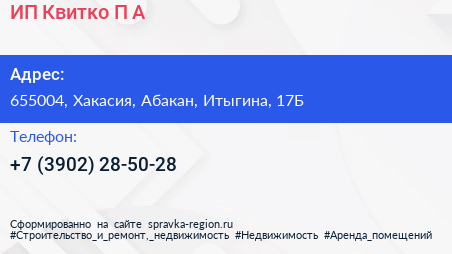 ИП Квитко П.А. по адресу 655004, Хакасия, Абакан, Итыгина, 17Б в дальнейшем Организация, размещена в следующих категориях: