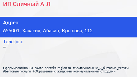 ИП Сличный А.Л. по адресу 655001, Хакасия, Абакан, Крылова, 112 в дальнейшем Организация, размещена в следующих категориях: