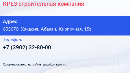 КРЕЗ, строительная компания по адресу 655670, Хакасия, Абакан, Кирпичная, 15в в дальнейшем Организация, размещена в следующих категориях: