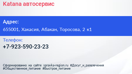 Katana, автосервис по адресу 655001, Хакасия, Абакан, Торосова, 2 к1 в дальнейшем Организация, размещена в следующих категориях: