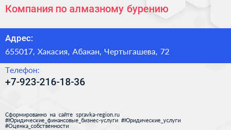 Компания по алмазному бурению по адресу 655017, Хакасия, Абакан, Чертыгашева, 72 в дальнейшем Организация, размещена в следующих категориях: