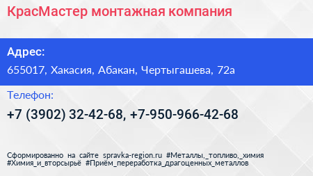 КрасМастер, монтажная компания по адресу 655017, Хакасия, Абакан, Чертыгашева, 72а в дальнейшем Организация, размещена в следующих категориях: