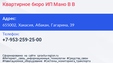Квартирное бюро, ИП Мано В.В. по адресу 655002, Хакасия, Абакан, Гагарина, 39 в дальнейшем Организация, размещена в следующих категориях: