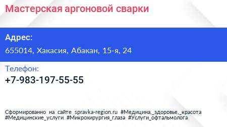 Мастерская аргоновой сварки по адресу 655014, Хакасия, Абакан, 15-я, 24 в дальнейшем Организация, размещена в следующих категориях: