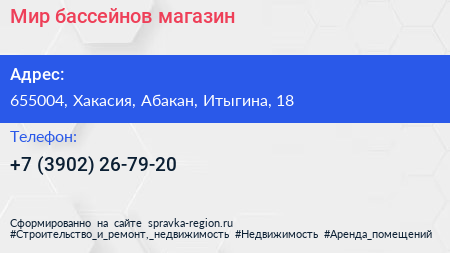 Мир бассейнов, магазин по адресу 655004, Хакасия, Абакан, Итыгина, 18 в дальнейшем Организация, размещена в следующих категориях:
