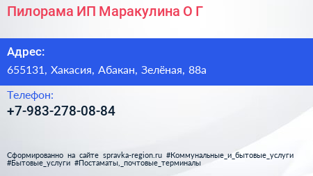 Пилорама, ИП Маракулина О.Г. по адресу 655131, Хакасия, Абакан, Зелёная, 88а в дальнейшем Организация, размещена в следующих категориях: