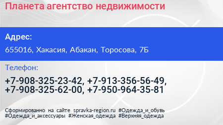 Планета, агентство недвижимости по адресу 655016, Хакасия, Абакан, Торосова, 7Б в дальнейшем Организация, размещена в следующих категориях: