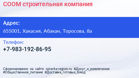 СООМ, строительная компания по адресу 655001, Хакасия, Абакан, Торосова, 8а в дальнейшем Организация, размещена в следующих категориях:
