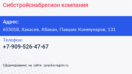Сибстройснабрегион, компания по адресу 655018, Хакасия, Абакан, Павших Коммунаров, 131 в дальнейшем Организация, размещена в следующих категориях: