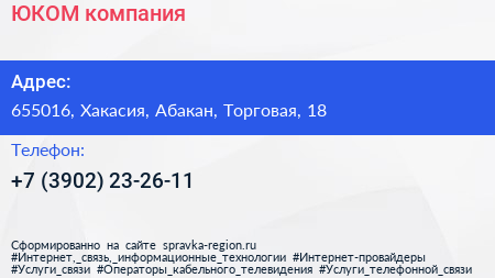 ЮКОМ, компания по адресу 655016, Хакасия, Абакан, Торговая, 18 в дальнейшем Организация, размещена в следующих категориях: