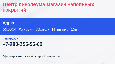 Центр линолеума, магазин напольных покрытий по адресу 655004, Хакасия, Абакан, Итыгина, 15в в дальнейшем Организация, размещена в следующих категориях: