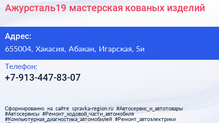 Ажурсталь19, мастерская кованых изделий по адресу 655004, Хакасия, Абакан, Игарская, 5и в дальнейшем Организация, размещена в следующих категориях: