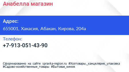 Анабелла, магазин по адресу 655001, Хакасия, Абакан, Кирова, 204а в дальнейшем Организация, размещена в следующих категориях: