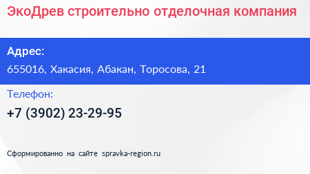 ЭкоДрев, строительно-отделочная компания по адресу 655016, Хакасия, Абакан, Торосова, 21 в дальнейшем Организация, размещена в следующих категориях: