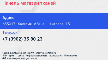 Нинель, магазин тканей по адресу 655017, Хакасия, Абакан, Чкалова, 15 в дальнейшем Организация, размещена в следующих категориях: