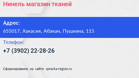 Нинель, магазин тканей по адресу 655017, Хакасия, Абакан, Пушкина, 115 в дальнейшем Организация, размещена в следующих категориях: