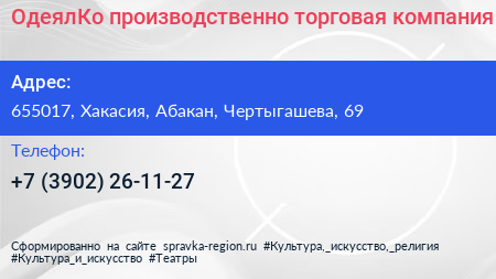 ОдеялКо, производственно-торговая компания по адресу 655017, Хакасия, Абакан, Чертыгашева, 69 в дальнейшем Организация, размещена в следующих категориях: