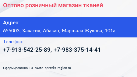 Оптово-розничный магазин тканей по адресу 655003, Хакасия, Абакан, Маршала Жукова, 101а в дальнейшем Организация, размещена в следующих категориях: