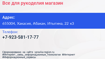 Все для рукоделия, магазин по адресу 655004, Хакасия, Абакан, Итыгина, 22 к3 в дальнейшем Организация, размещена в следующих категориях:
