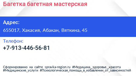 Багетка, багетная мастерская по адресу 655017, Хакасия, Абакан, Вяткина, 45 в дальнейшем Организация, размещена в следующих категориях: