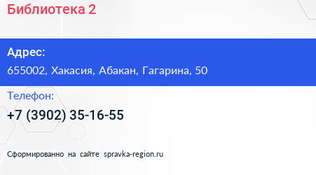 Библиотека №2 по адресу 655002, Хакасия, Абакан, Гагарина, 50 в дальнейшем Организация, размещена в следующих категориях: