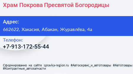 Храм Покрова Пресвятой Богородицы по адресу 662622, Хакасия, Абакан, Журавлёва, 4а в дальнейшем Организация, размещена в следующих категориях:
