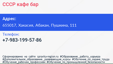 СССР, кафе-бар по адресу 655017, Хакасия, Абакан, Пушкина, 111 в дальнейшем Организация, размещена в следующих категориях: