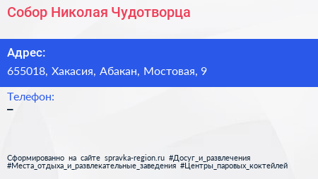 Собор Николая Чудотворца по адресу 655018, Хакасия, Абакан, Мостовая, 9 в дальнейшем Организация, размещена в следующих категориях: