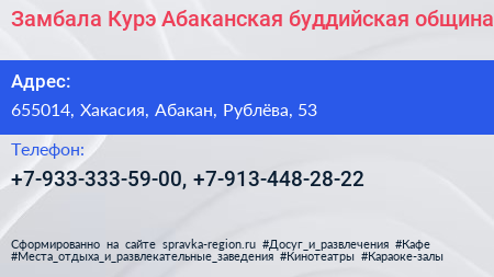 Замбала-Курэ, Абаканская буддийская община по адресу 655014, Хакасия, Абакан, Рублёва, 53 в дальнейшем Организация, размещена в следующих категориях: