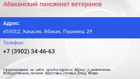 Абаканский пансионат ветеранов по адресу 655012, Хакасия, Абакан, Пушкина, 29 в дальнейшем Организация, размещена в следующих категориях: