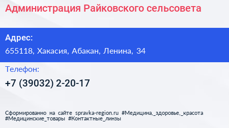 Администрация Райковского сельсовета по адресу 655118, Хакасия, Абакан, Ленина, 34 в дальнейшем Организация, размещена в следующих категориях: