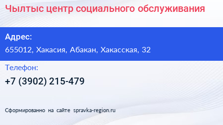 Чылтыс, центр социального обслуживания по адресу 655012, Хакасия, Абакан, Хакасская, 32 в дальнейшем Организация, размещена в следующих категориях: