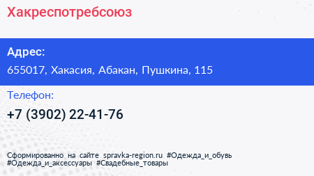 Хакреспотребсоюз по адресу 655017, Хакасия, Абакан, Пушкина, 115 в дальнейшем Организация, размещена в следующих категориях: