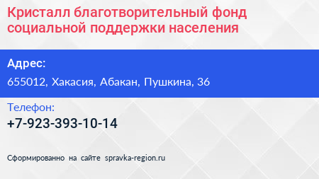 Кристалл, благотворительный фонд социальной поддержки населения по адресу 655012, Хакасия, Абакан, Пушкина, 36 в дальнейшем Организация, размещена в следующих категориях: