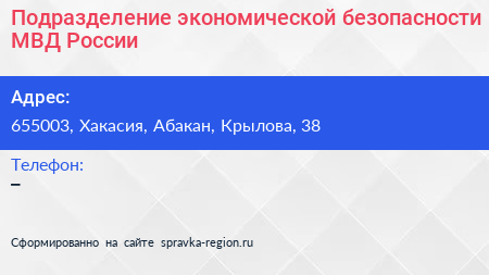 Подразделение экономической безопасности МВД России по адресу 655003, Хакасия, Абакан, Крылова, 38 в дальнейшем Организация, размещена в следующих категориях: