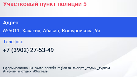 Участковый пункт полиции №5 по адресу 655011, Хакасия, Абакан, Кошурникова, 9а в дальнейшем Организация, размещена в следующих категориях:
