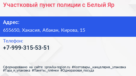Участковый пункт полиции, с. Белый Яр по адресу 655650, Хакасия, Абакан, Кирова, 15 в дальнейшем Организация, размещена в следующих категориях: