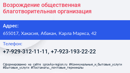 Возрождение, общественная благотворительная организация по адресу 655017, Хакасия, Абакан, Карла Маркса, 42 в дальнейшем Организация, размещена в следующих категориях: