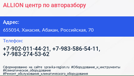 ALLION, центр по авторазбору по адресу 655014, Хакасия, Абакан, Российская, 70 в дальнейшем Организация, размещена в следующих категориях: