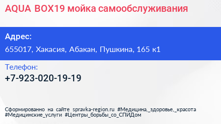 AQUA BOX19, мойка самообслуживания по адресу 655017, Хакасия, Абакан, Пушкина, 165 к1 в дальнейшем Организация, размещена в следующих категориях: