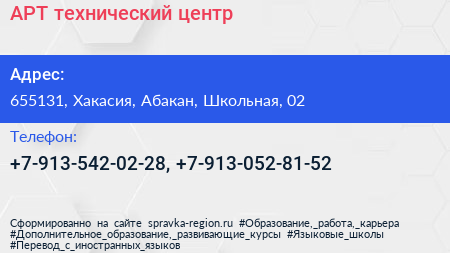 АРТ, технический центр по адресу 655131, Хакасия, Абакан, Школьная, 02 в дальнейшем Организация, размещена в следующих категориях: