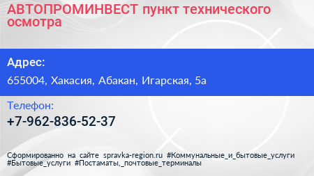 АВТОПРОМИНВЕСТ, пункт технического осмотра по адресу 655004, Хакасия, Абакан, Игарская, 5а в дальнейшем Организация, размещена в следующих категориях: