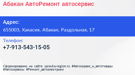 Абакан АвтоРемонт, автосервис по адресу 655003, Хакасия, Абакан, Раздольная, 17 в дальнейшем Организация, размещена в следующих категориях: