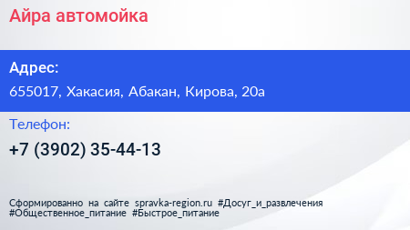 Айра, автомойка по адресу 655017, Хакасия, Абакан, Кирова, 20а в дальнейшем Организация, размещена в следующих категориях:
