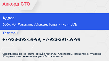 Аккорд, СТО по адресу 655670, Хакасия, Абакан, Кирпичная, 39Б в дальнейшем Организация, размещена в следующих категориях: