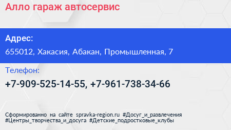 Алло, гараж!, автосервис по адресу 655012, Хакасия, Абакан, Промышленная, 7 в дальнейшем Организация, размещена в следующих категориях: