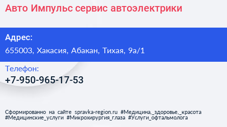 Авто Импульс, сервис автоэлектрики по адресу 655003, Хакасия, Абакан, Тихая, 9а/1 в дальнейшем Организация, размещена в следующих категориях: