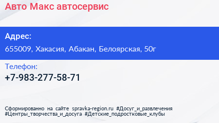 Авто-Макс, автосервис по адресу 655009, Хакасия, Абакан, Белоярская, 50г в дальнейшем Организация, размещена в следующих категориях: