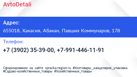 AvtoDetali по адресу 655018, Хакасия, Абакан, Павших Коммунаров, 178 в дальнейшем Организация, размещена в следующих категориях: