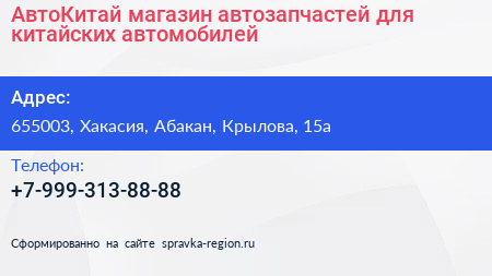 АвтоКитай, магазин автозапчастей для китайских автомобилей по адресу 655003, Хакасия, Абакан, Крылова, 15а в дальнейшем Организация, размещена в следующих категориях: